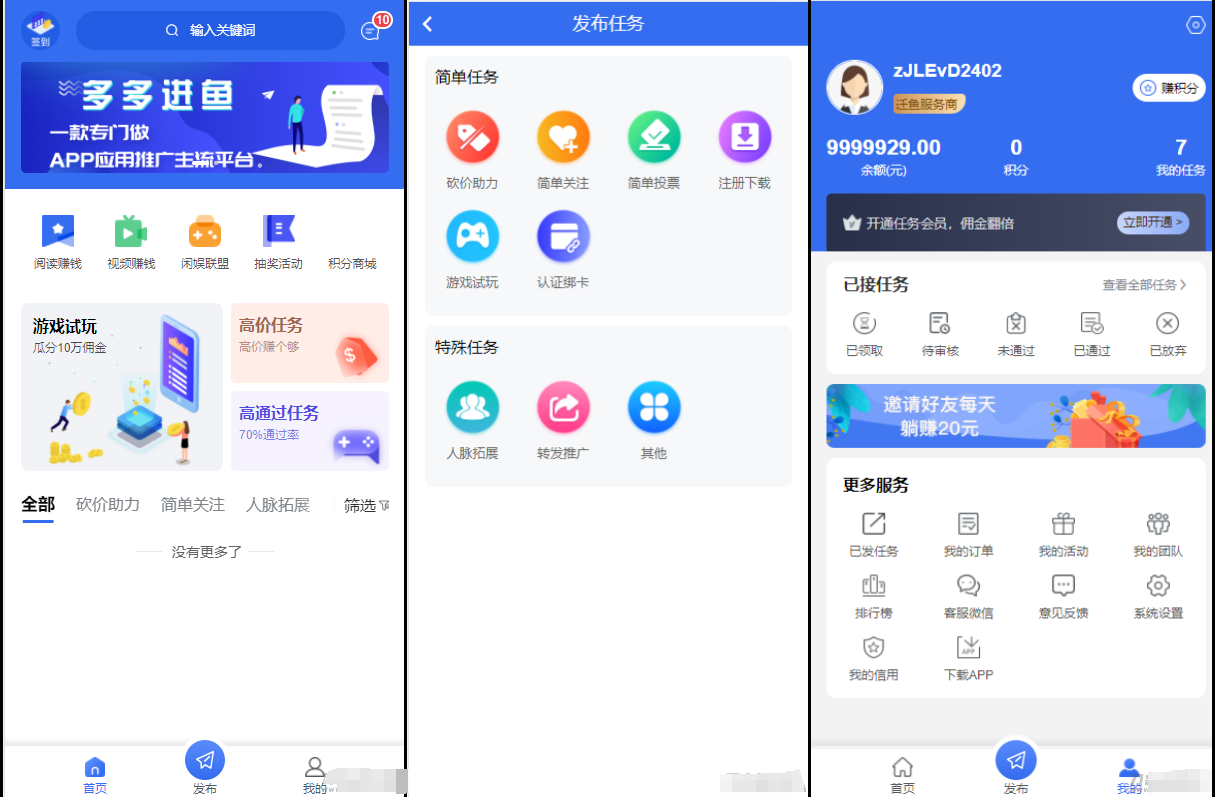 任务管理:包含平台的任务列表和用户任务列表,以及任务订单的相关管理。