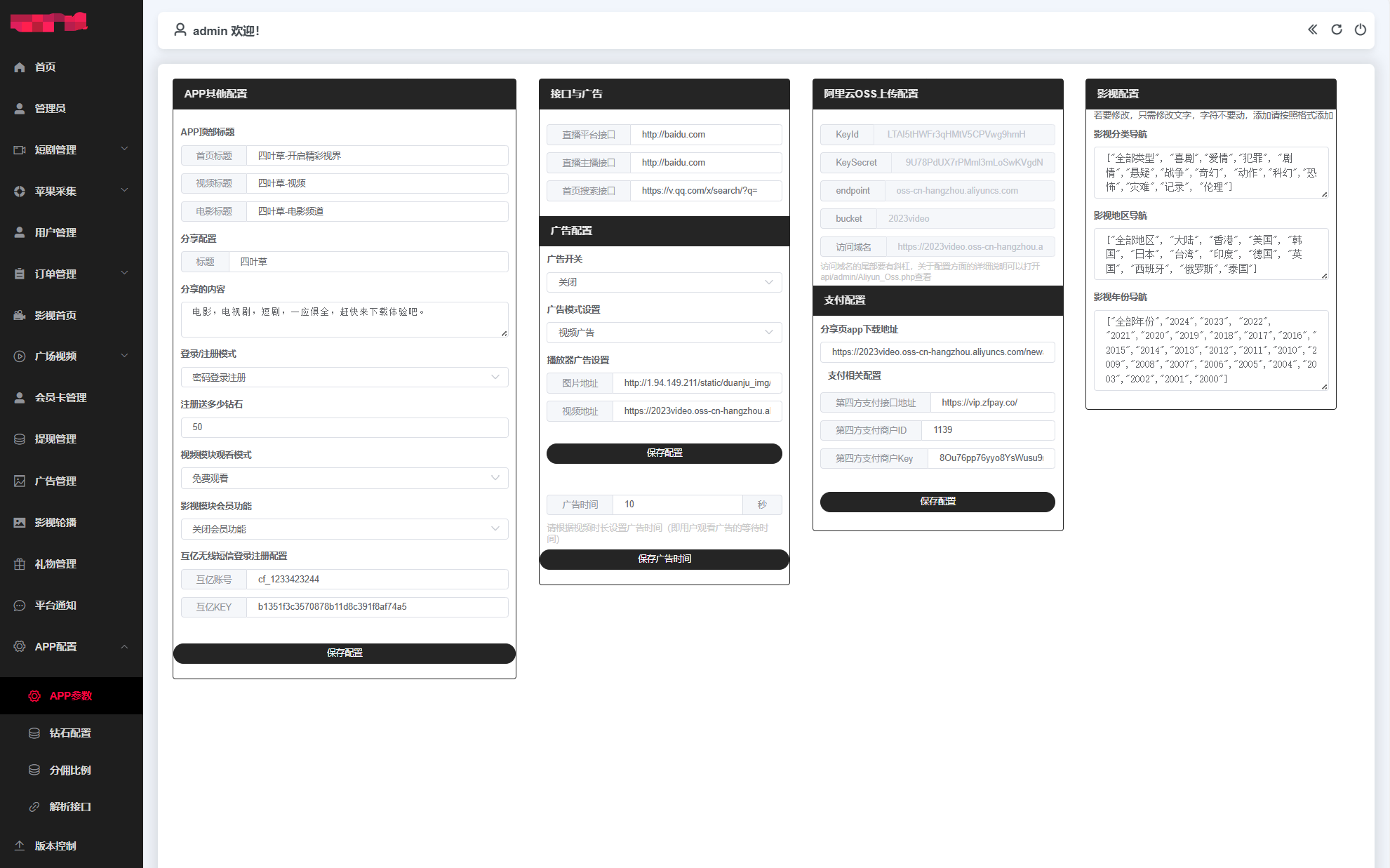 重要提示:修改后台的任何HTML、JS文件后一定要清理浏览器缓存,否则可能不生效。关于苹果CMS系统,这个只是用来采集电影电视剧用的,还使用了苹果cms自带的卡密功,用来激活app会员或者充值钻石,或者你也可以自己做一个卡密系统,还使用了苹果cms的影视分类功能,苹果cms已与app对接了,所以如非必要或者不懂,请不要改动苹果cms的任何设置,尤其是苹果cms的电影分类,切记不要去删除重新添加,请在原基础上修改即可,改动造成的错误自己解决。(做任何改动请先备份,这是良好的习惯)